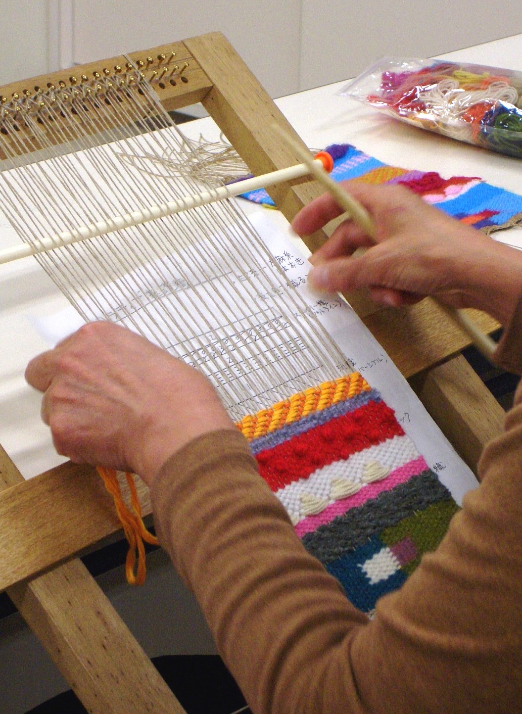 ご案内 ※はじめは簡易織機(段ボール)の使用も可能ですが、木製織機の購入も可(5000円~8000円)。※机の上に置ける50cm程度の織機をお持ちであればご使用いただけます。初回、講師にご確認ください。