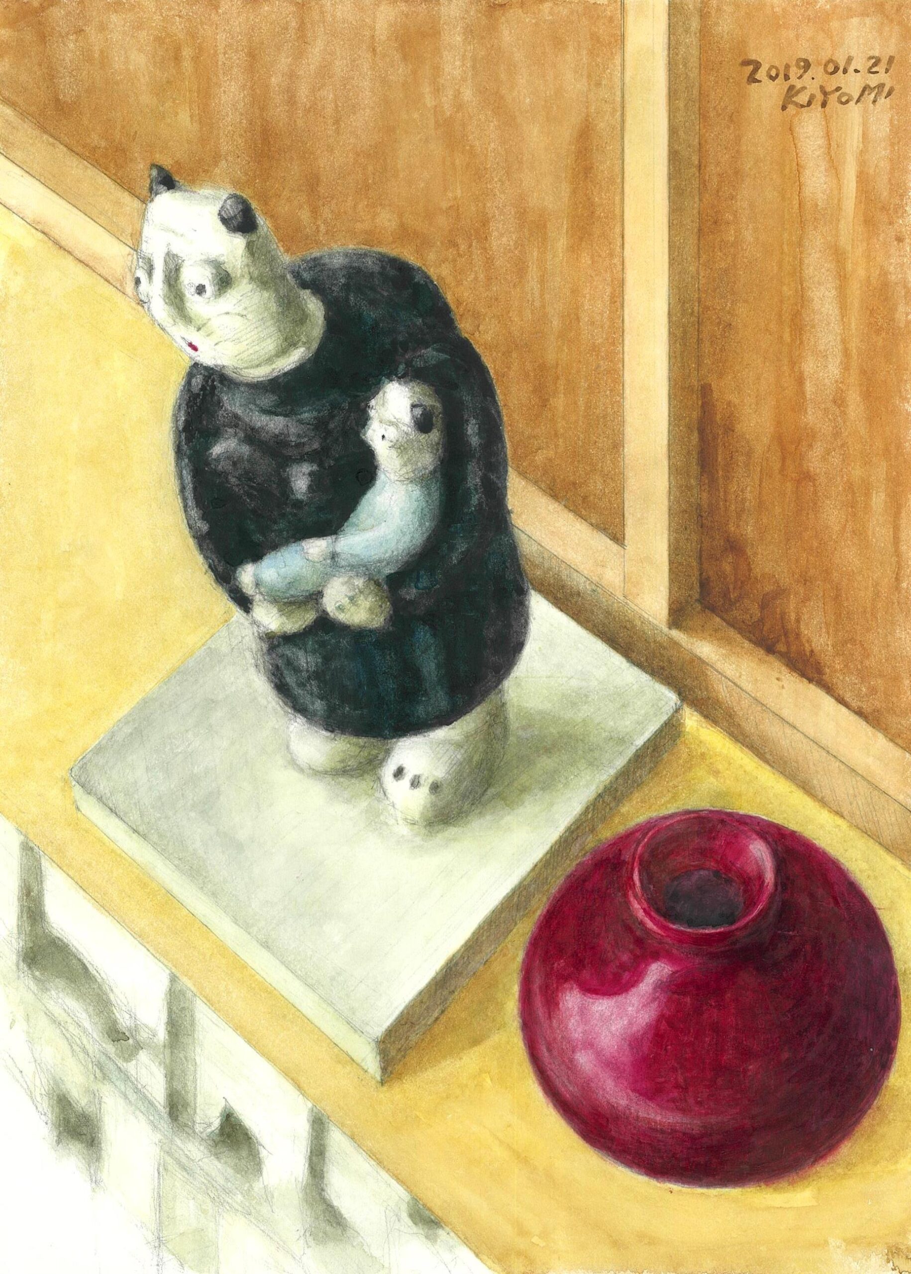 アクリル画 洋ナシ 水彩 杉村 赤い壺