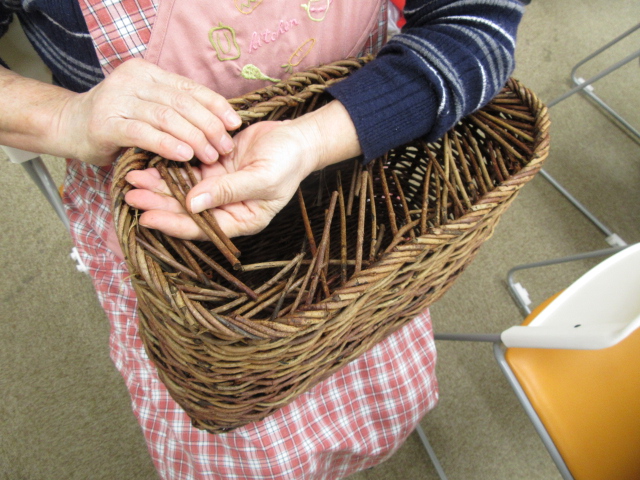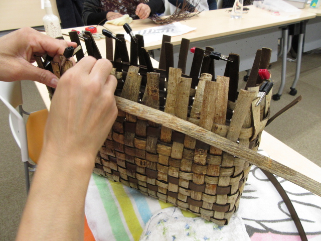 初心者の場合、まずは基本の花入れや持ち手付きのかご等の小物を作りながら技法を学びます。