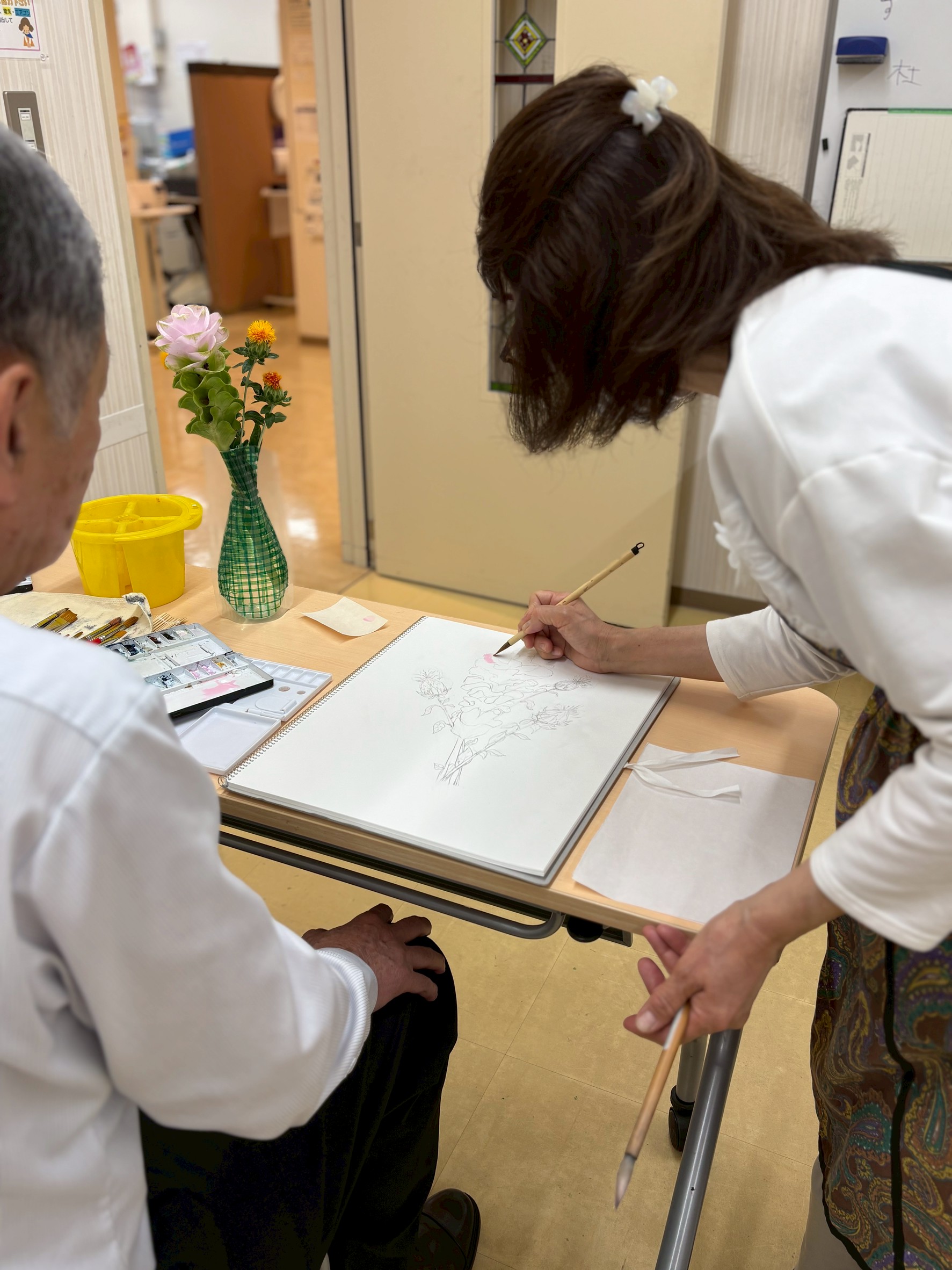 デッサンや構図などの絵の基本から始め、顔彩や岩絵の具の筆使いまで指導します。