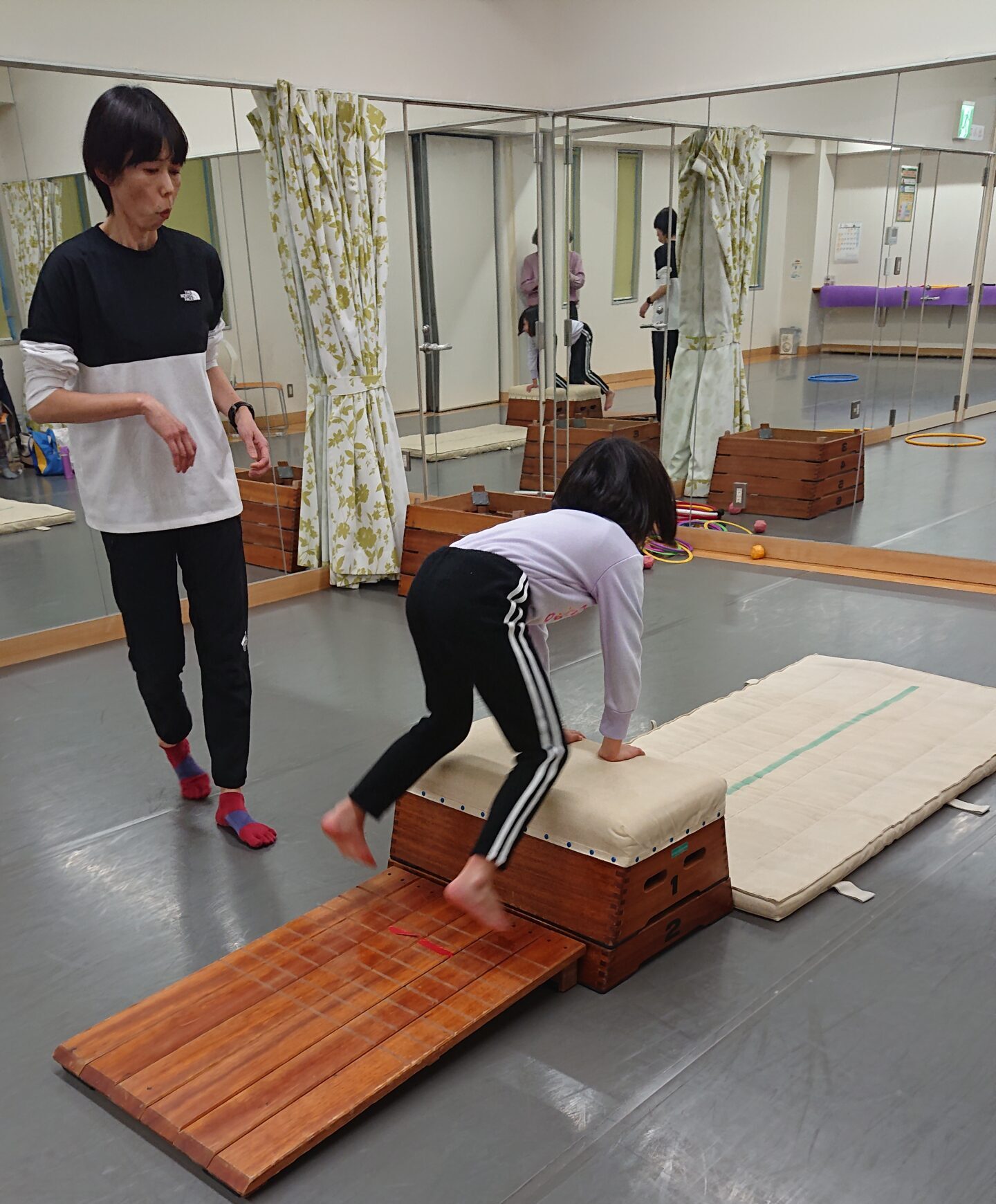 ・講座では、準備運動から始めて、マットやとび箱・鉄棒などを使って進めます