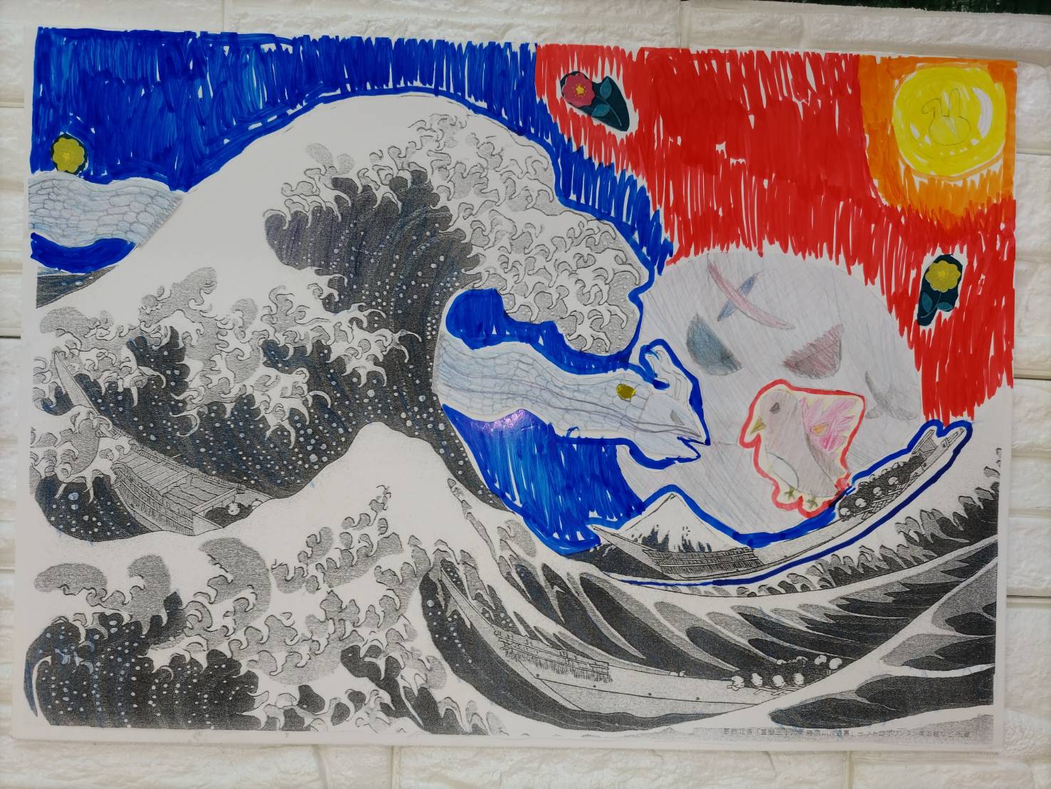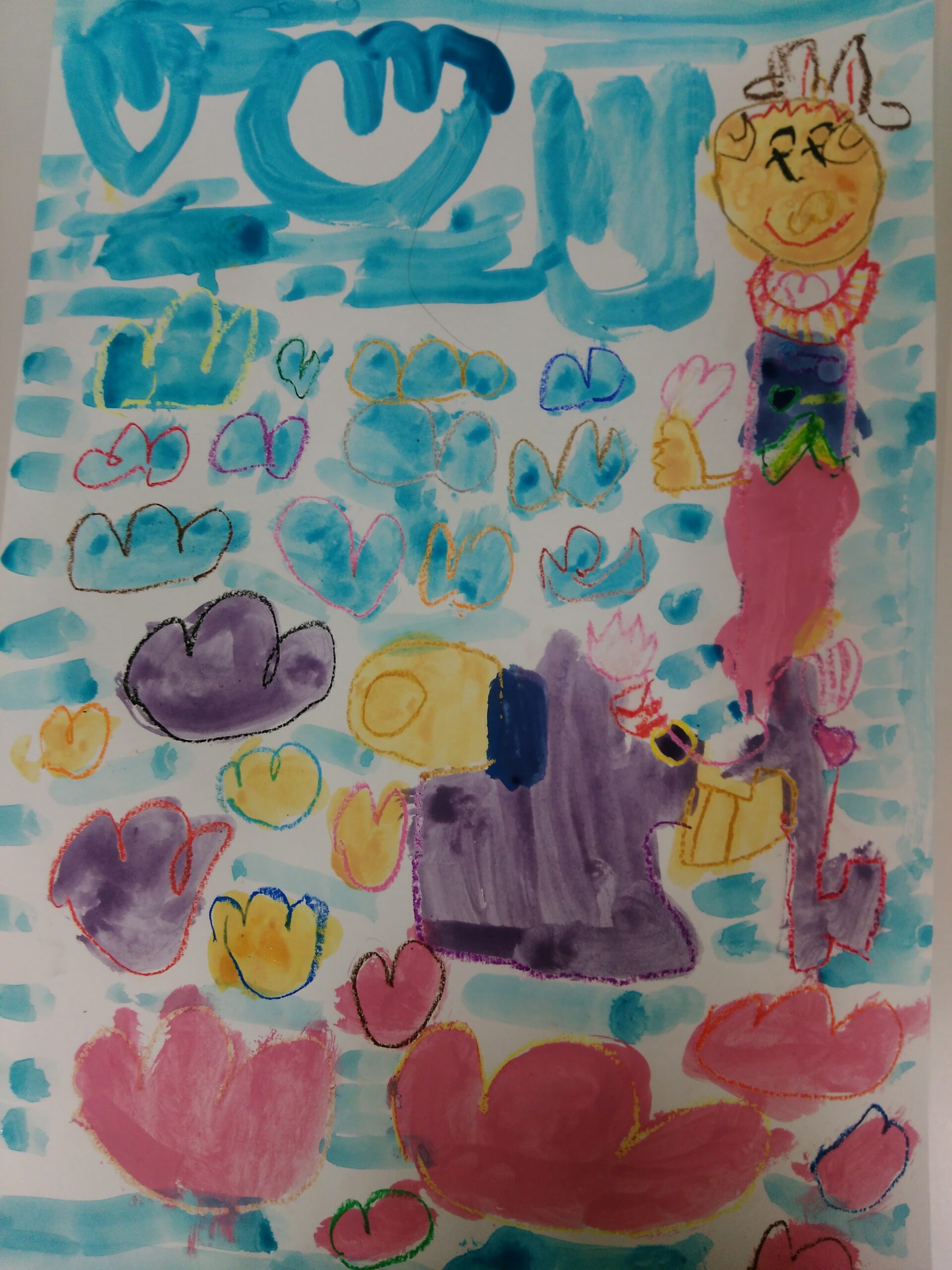 水彩絵の具を使って主に描きますが、時にはアクリル絵の具やクレヨンなども使ったり、紙粘土で立体造形を楽しむなど自由な表現を広げていきます。絵画と造形は、半々程度の割合です。