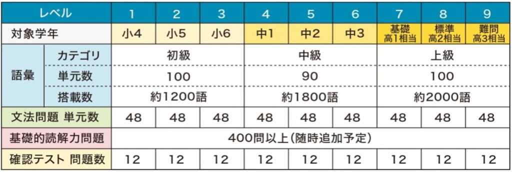 テスト・入試でよく使われる語彙に絞り、小・中・高、累計5000語を学びます。