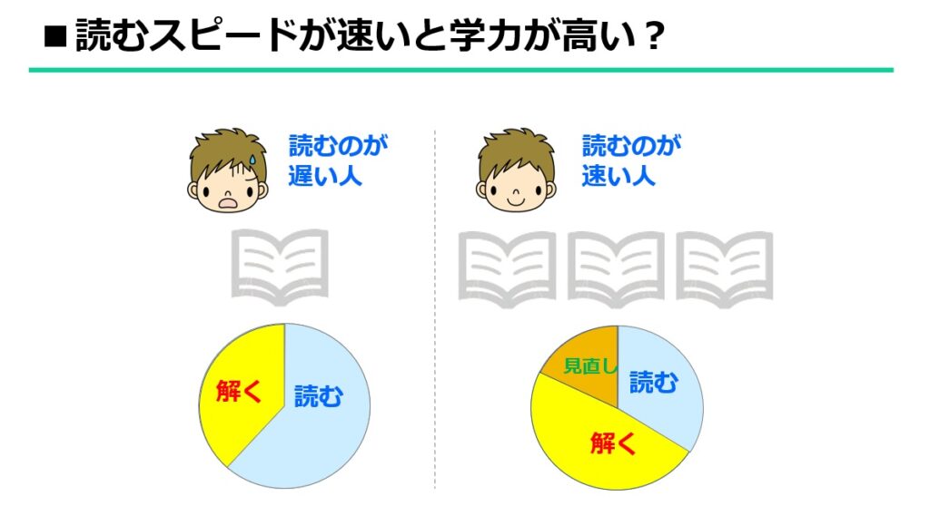 問題を読むスピードをアップさせることで、解く時間を充分に確保し、あまった時間で見直しまで行うことができます。