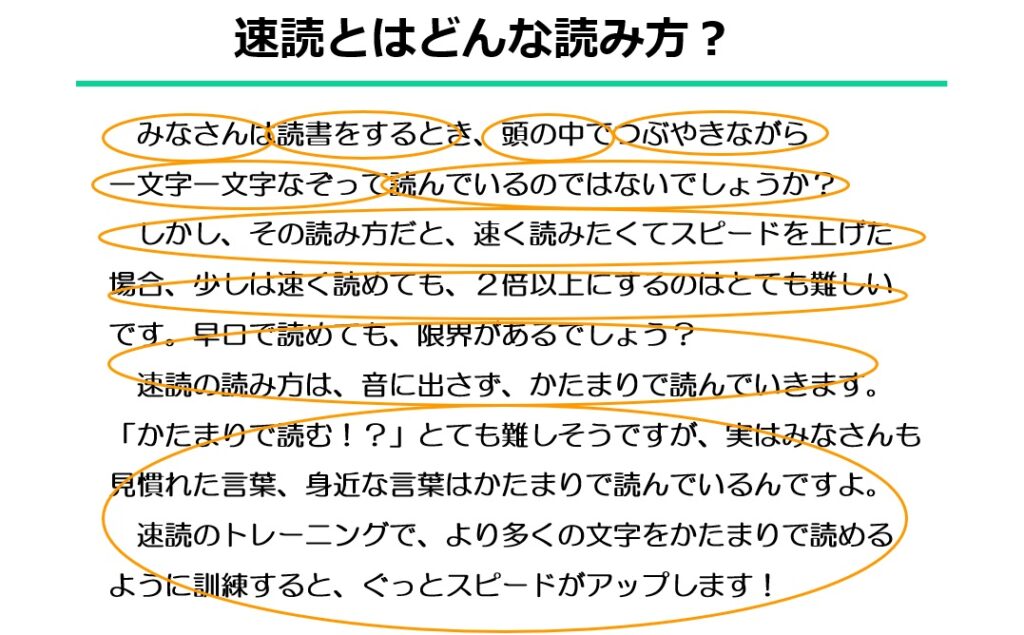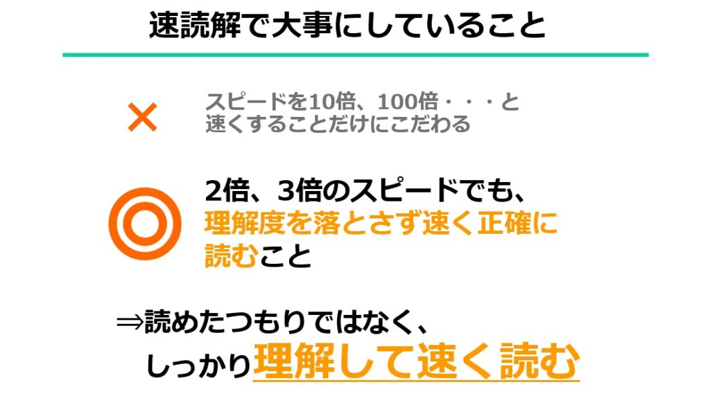 2)斜め読みや飛ばし読みではない、理解度や記憶力をともなった読み方です