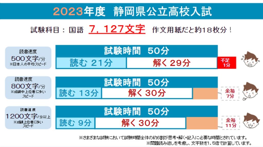 - 受験対策: 中学受験や高校受験、大学入試では、長文読解が増えており、日本人の平均読書スピード500文字/分ではすべての問題を解ききれません。成績上位者の読書スピードは1200文字/分とも言われており、読書スピードと読解力が合否を左右することが多くなっています