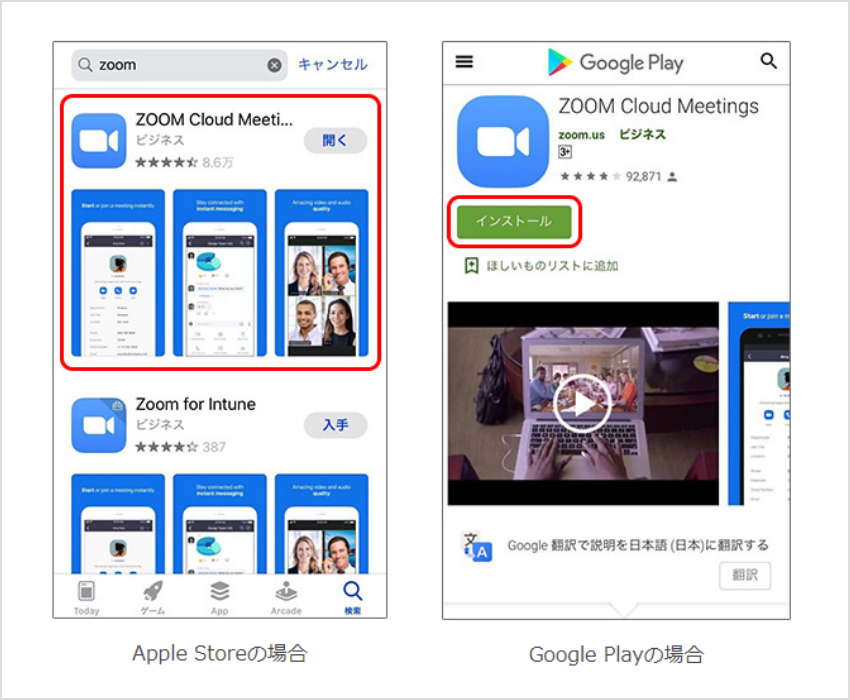 「ZOOM Cloud Meetings」アプリをインストールします。