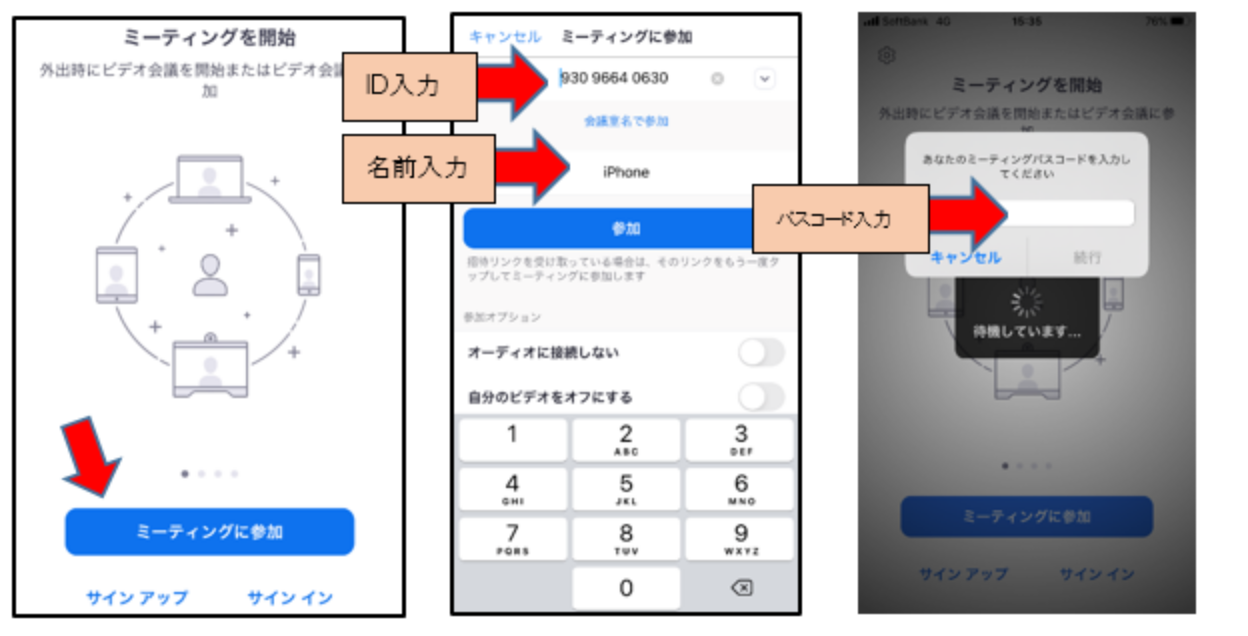 Zoomサイトに接続(携帯の方はZoomアプリを起動)し、招待メールに記載の「ミーティングID」と「パスコード」を使って参加できます。※下図参照