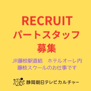 藤枝スクール パートスタッフ募集のお知らせ 2024.06.18 JR藤枝駅直結 【ホテルオーレ】3階にある、静岡朝日テレビカルチャー 藤枝スクールで、パートスタッフ募集中です 藤枝スクール※島田にも月に数回勤務出来る方優遇します 詳細はこちらから